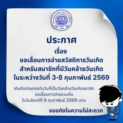 หากสมาชิกโอนเงินแล้ว กรุณาโทรแจ้งฝ่ายบัญชี ทันที โทร. 032-602343 ต่อ 110, 083-8362406