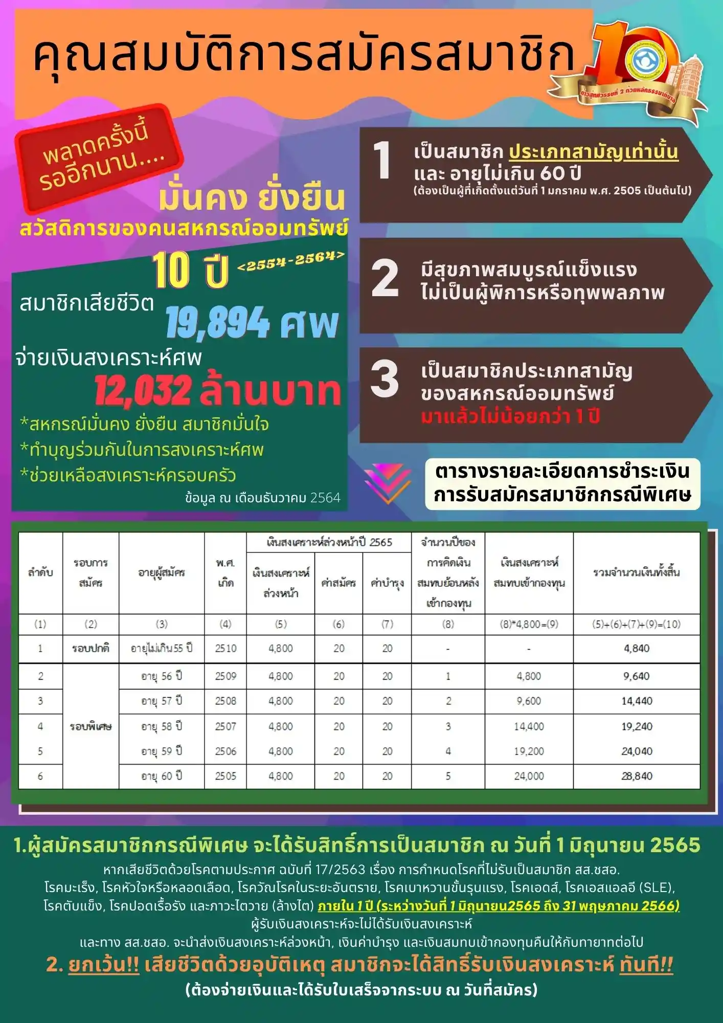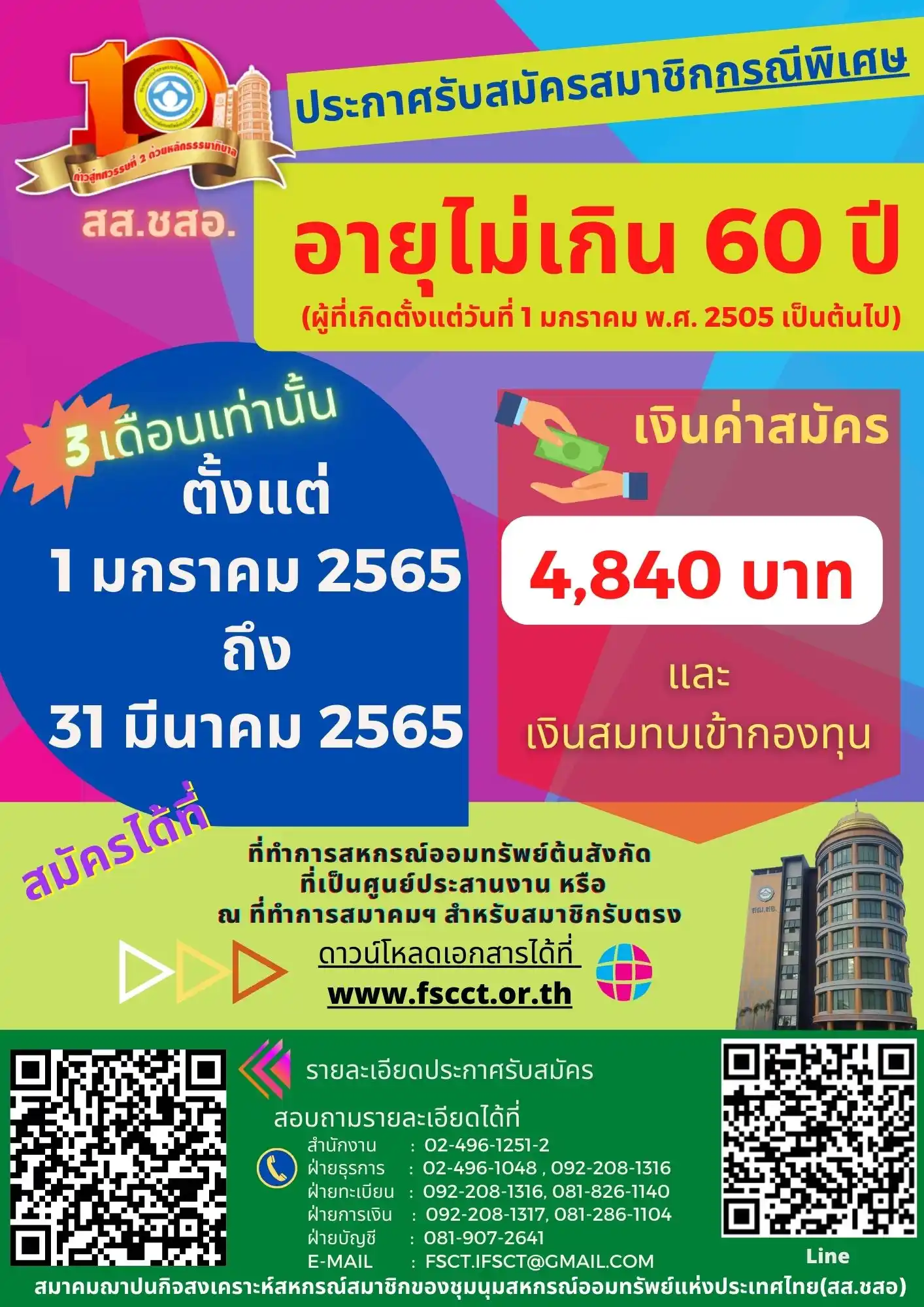 ประชาสัมพันธ์เรื่องการรับสมัครสมาชิกสมาคมฌาปนกิจสงเคราะห์สหกรณ์สมาชิกของชุมนุมสหกรณ์ออมทรัพย์แห่งประเทศไทย (สส.ชสอ.) กรณีพิเศษ (สำหรับผู้ที่มีอายุไม่เกิน 60 ปี)