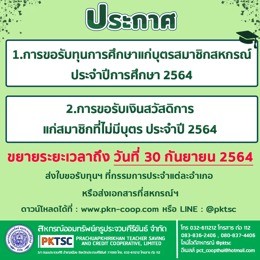 ประกาศ เรื่องขยายระยะเวลาการขอรับทุนการศึกษาแก่บุตรสมาชิกสหกรณ์ และ การขอรับเงินสวัสดิการแก่สมาชิกที่ไม่มีบุตร ประจำปี 2564 จากเดิมที่ส่งเอกสารไม่เกินวันที่ 31 สิงหาคม 2564 เป็นวันที่ 30 กันยายน 2564 ทั้งนี้สมาชิกสามารถดาวน์โหลดเอกสารขอรับทุนการศึกษาบุตรและสวัสดิการสมาชิกที่ไม่มีบุตรได้ด้านล่างนี้