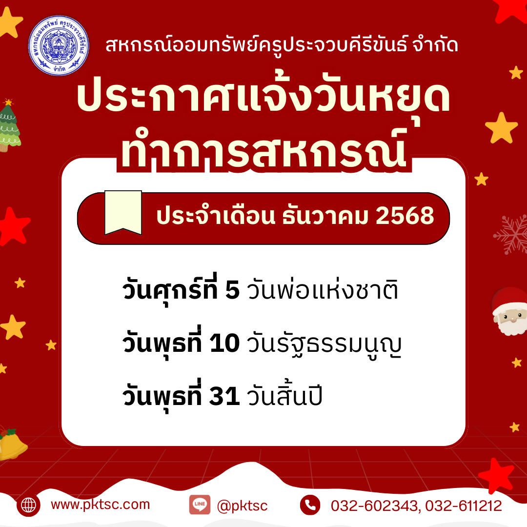 ประกาศวันหยุดให้บริการประจำเดือน ธันวาคม 2568 28 พฤศจิกายน 202528 พฤศจิกายน 2025 admin ข่าวสารสหกรณ์ สมาชิกโปรดตรวจสอบวันหยุดและวางแผนการทำธุรกรรม