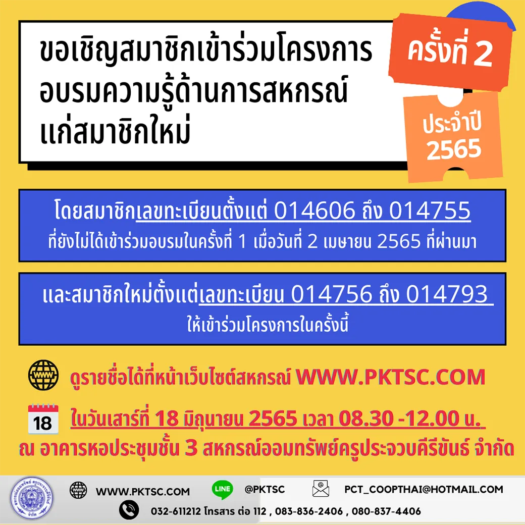 (หากท่านยังไม่ผ่านการอบรมตามโครงการฯในรอบที่ 2 นี้ สหกรณ์ฯขอสงวนสิทธิ์ในการจ่ายเงินสวัสดิการต่างๆ จนกว่าท่านจะผ่านการอบรมตามโครงการฯในครั้งต่อไป)
